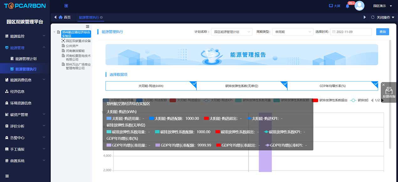 通过实时测算园区碳排放,并进行碳排放预警,帮助园区做好碳排放额度规划,避免超额使用导致停工限产。