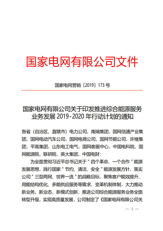 近日,国家电网有限公司(下称“国网公司”)正式印发《推进综合能源服务业务发展2019-2020年行动计划》。