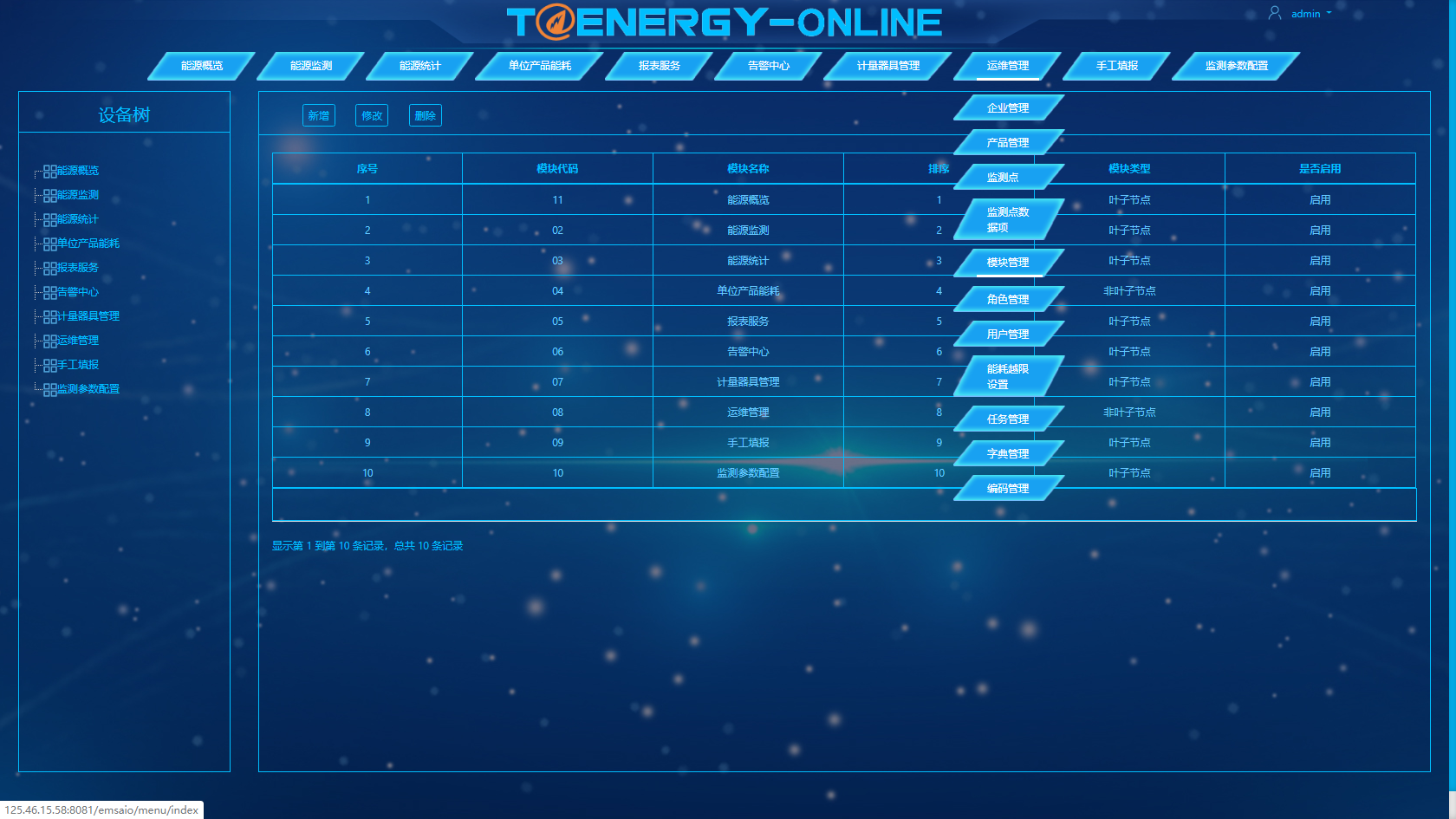 企业管理、产品管理、监测点、监测点数据项、模块管理、角色管理、用户管理、能耗越限设置、任务管理、字典管理、编码管理;