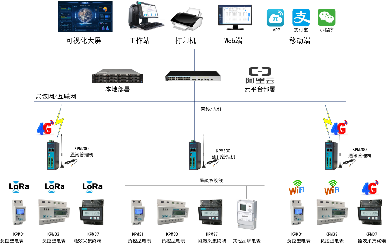 现场采用RS485、以太网GPRS、4G、NB-ot.lora、 Zigbeeifi等传输方式,将区域内的电力采集模块连接至相对的通讯管理机;各通讯管理机通过用户局域网连接至中央服务器。