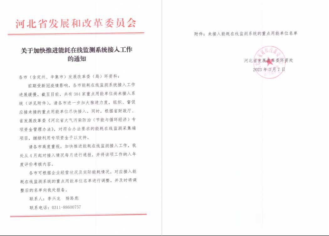 日前,河北省发改革委会下发红头文件,要求未接入能耗在线监测系统的重点用能单位请尽快接入,具体文件内容如下: