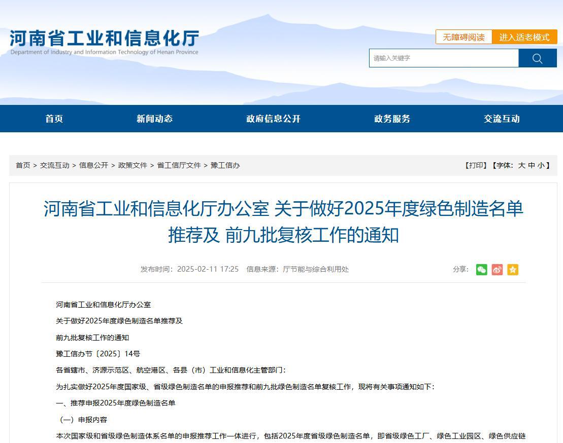 为推动河南省绿色制造体系的不断完善,绿色制造水平的稳步提高,河南省及各地市先后出台了一系列政策文件。省工信厅组织开展2025年度河南省绿色工厂、绿色工业园区申报工作。