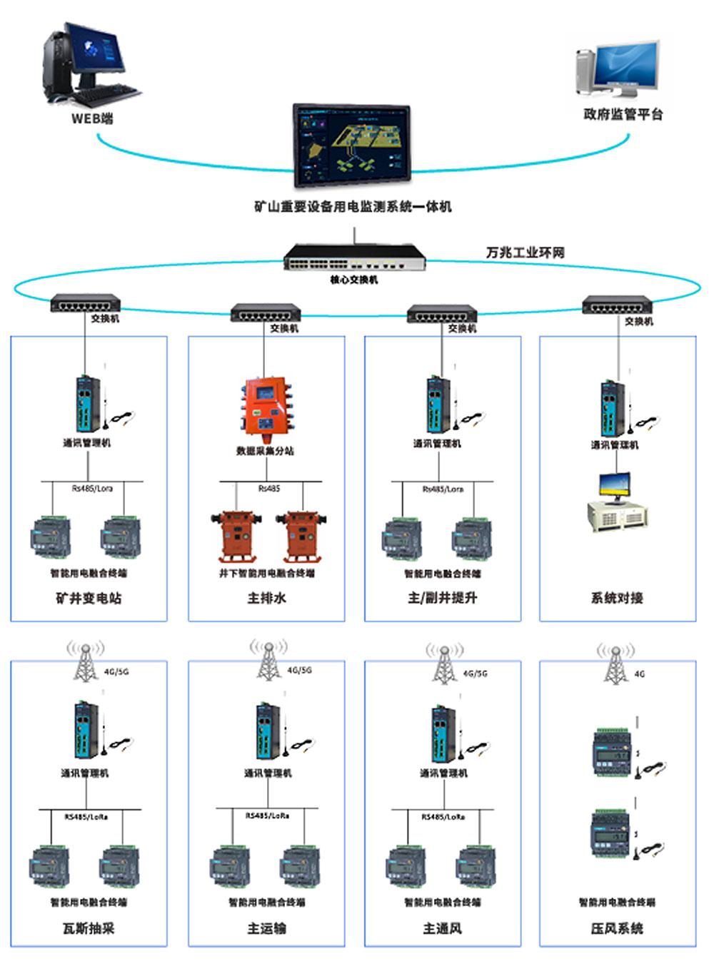 重点煤矿建设重要设备用电监测子系统在重点煤矿的矿井变电站、主运输、主通风、主排水、主副提升等重要设备上加装智能用电融合终端,实时监测煤矿重要设备的电流、电压、负载等主要数据变化。为管理人员提供实时监测、报表管理、告警中心、台账管理、运维管理、数据上传等业务功能模块。