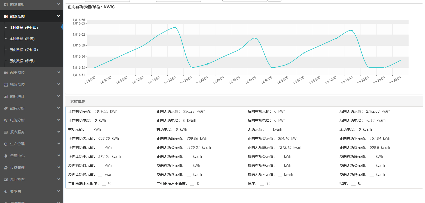 该功能分为四个模块,可对实时(分钟级、秒级)用能数据的监测与展现;也可以对历史用能数据进行存储和查询,可自定义查询某一时间段内的用能数据。