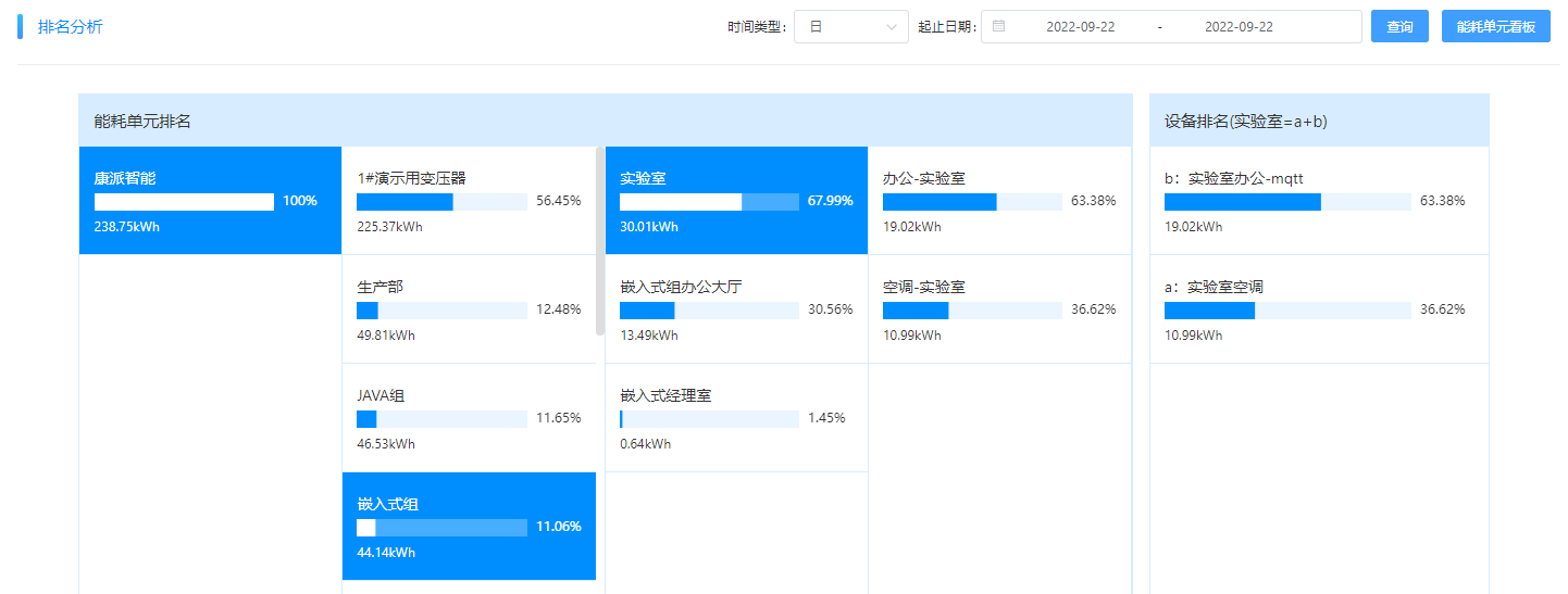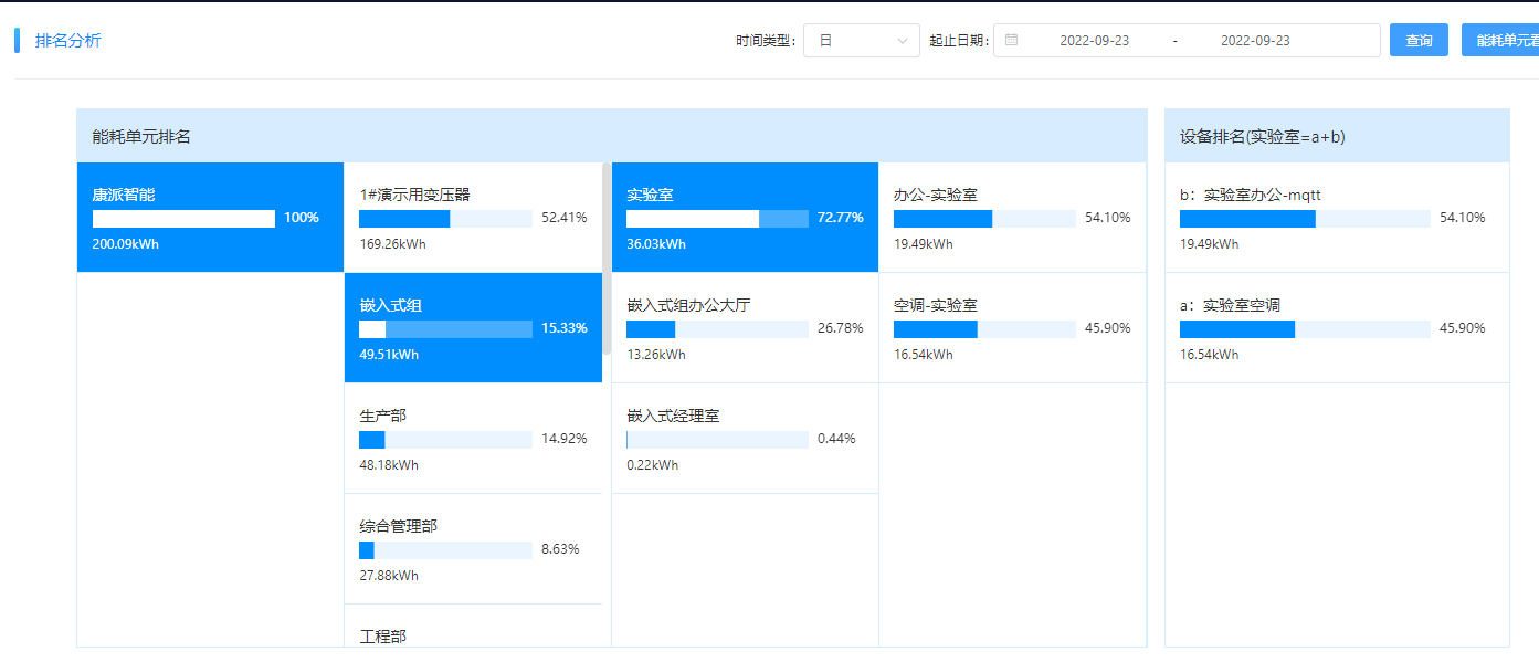 沿途索骥。通过前后两天的能耗排名变化,确定异常用能部门。嵌入式组的用电排名,22号在第4位,23号升到第二位,多出了5kWh左右。通过对嵌入式组下一级的能耗对比发现为实验室用能比前一天多了6kWh左右,再进一步对实验室的下一级能耗分析,发现为实验室空调比前一日多了6kWh。可以初步确认是实验室的空调在非工作时间没有关机。
