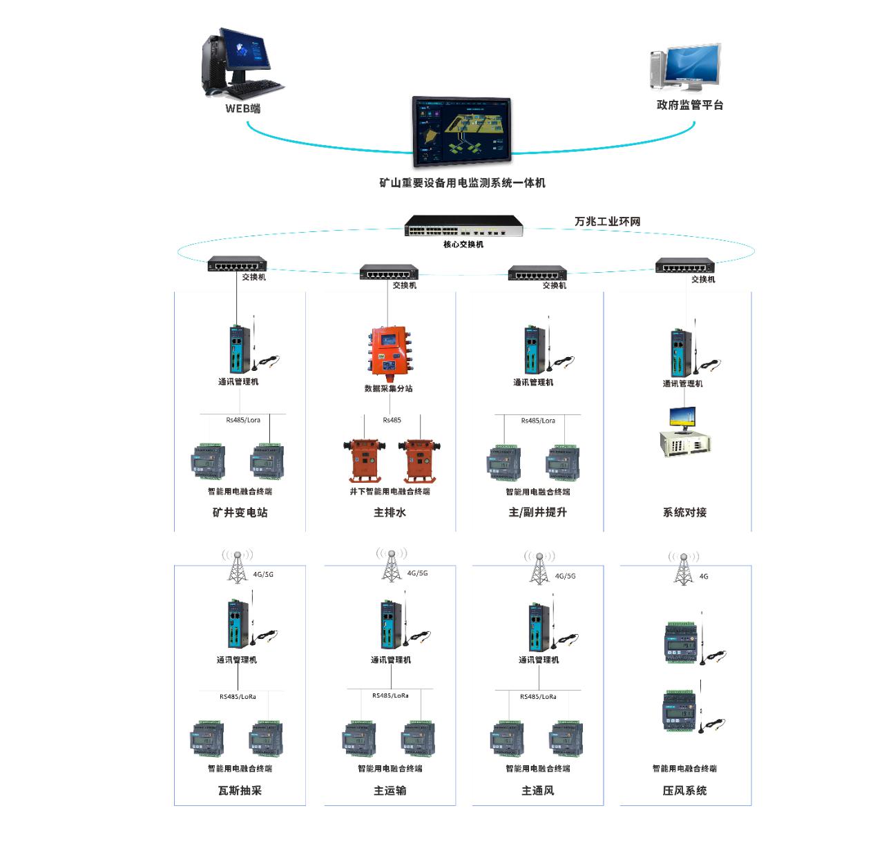 ·网络层:以矿山内部通讯管理机及相关网络线路组成,通讯管理机用于末端计量表计和第三方监测系统内数据的采集、存储、协议转换并上传至“管理一体机”或上级平台 。根据监测点位的数量和位置不同,可任意扩展通讯管理机的数量。