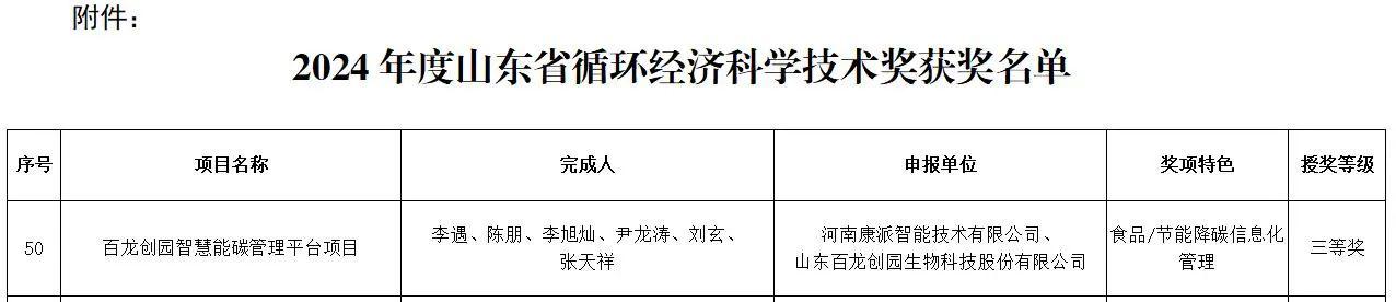 2024年12月18日,山东省循环经济协会组织的“2024年山东省循环经济科学技术奖”评审结果公布,由云顶国际牵头,山东百龙创园生物科技股份有限公司参与落地的《百龙创园智慧能碳管理平台项目》荣获“2024年度山东省循环经济科学技术奖”三等奖。